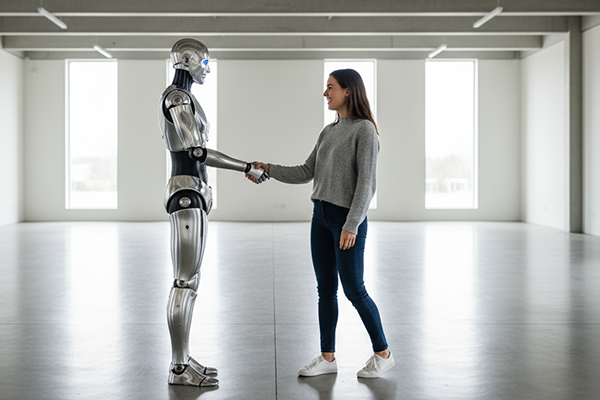 Dieses KI-Bild soll die Zusammenarbeit von einer fwg-Mitarbeiterin mit einer KI zeigen. Es ist das erste Ergebnis nach dem Prompt (Eingabebefehl) “generiere ein Bild, wo eine Künstliche Intelligenz (also Roboter) einer Frau die Hand schüttelt. Die Frau trägt die casual wear. beide stehen sich in einem großen meetingraum gegenüber”.