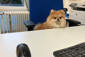 wir sind Antonia, Banu, Charlotte, Frederick, Jenna, Lutz, Nadine, Thorsten, Adrian und unser fleißigster Mitarbeiter, Don (rechts im Bild an seinem Arbeitsplatz).
