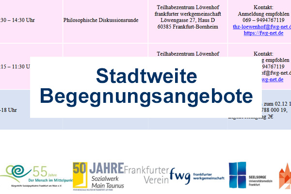 Im Freizeit- und Veranstaltungsprogramm der fwg bieten wir Ihnen ein vielfältiges Freizeitangebot und Ideen für Ihre Unternehmungen in Frankfurt. Alle sind willkommen ihre Freizeit gemeinsam mit uns zu gestalten. Wir freuen uns auf Ihr Kommen – gerne auch mit Freunden und Freundinnen, oder Angehörigen!